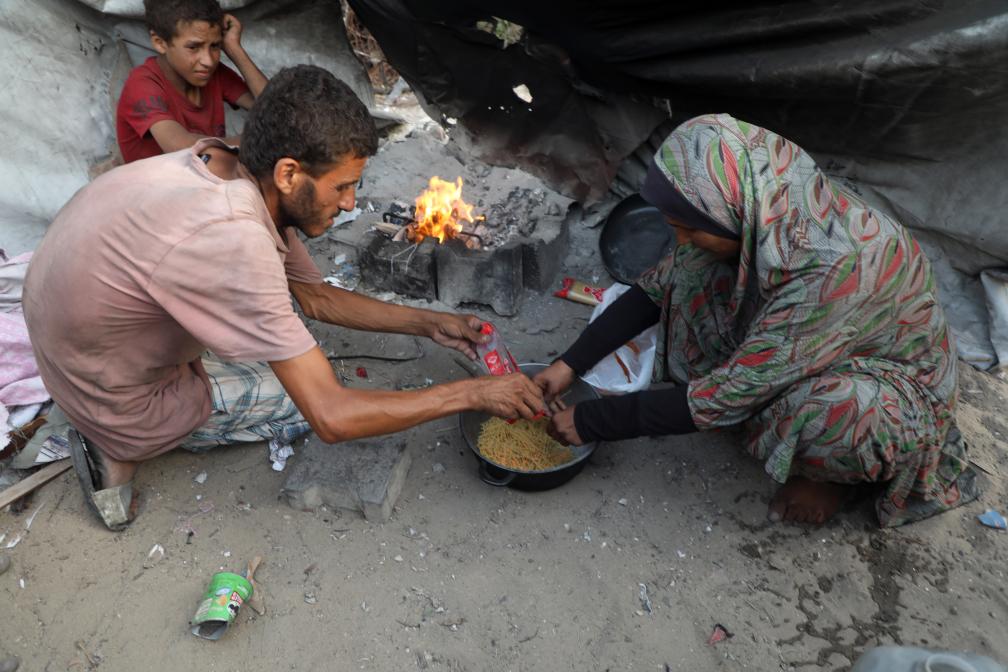 7月29日,在加沙城,一名男子和他的家人在帐篷里做饭。新华社发(里泽克·阿卜杜勒贾瓦德摄)