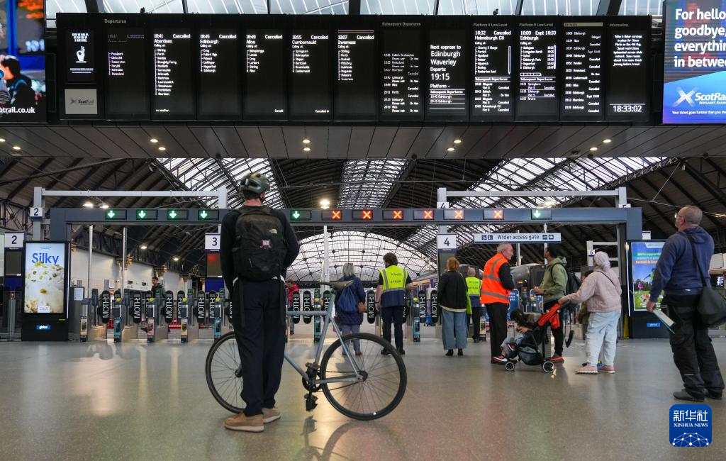 8月4日,在英国格拉斯哥皇后街火车站,电子屏幕上显示被取消的列车信息。新华社发(斯图尔特·华莱士摄)