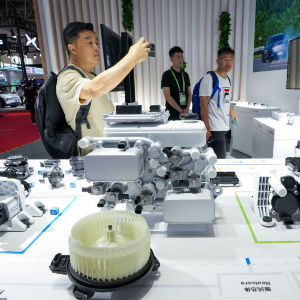 7月19日,在第三届中国国际供应链促进博览会设置的智能汽车链展区博世展台,参观者在拍摄面向新能源汽车的热管理系统解决方案展示。新华社记者鞠焕宗摄
