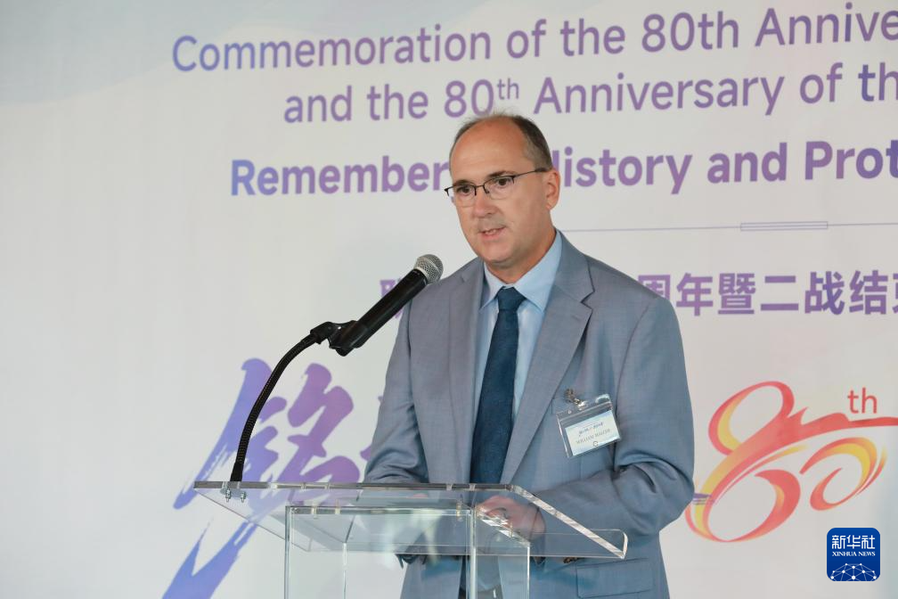 8月8日,在位于纽约的联合国总部,美国克莱姆森大学社会学教授威廉·哈勒在“铭记历史,共护和平”纪念世界反法西斯战争胜利和联合国成立80周年活动上演讲。新华社记者 谢锷 摄