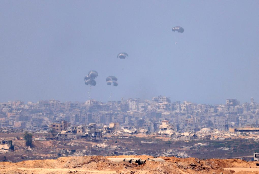 这是8月9日从以色列与加沙地带边境以方一侧拍摄的被空投至加沙地带的物资。新华社发(贾马尔·阿瓦德摄)