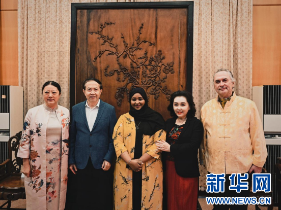 中华茶文化大使董晓欣(右二)与索马里驻华大使和丹(中)、著名雕塑家袁熙坤(左二)、著名设计师许茗(左一)等合影。