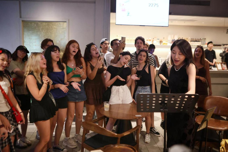 8月7日,外国青年在三里屯共唱《北京欢迎你》和《We Are The World》。(林丽园 摄)