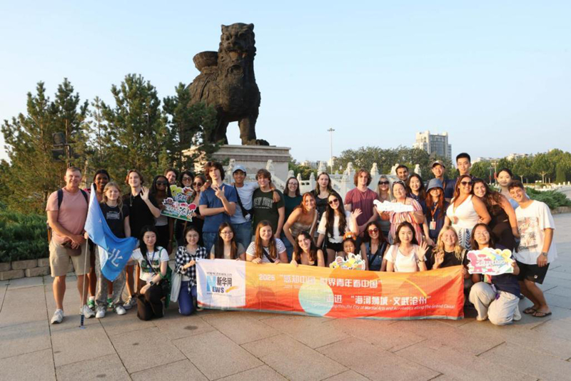 8月9日,“感知中国·世界青年看中国”采风团在沧州铁狮子前合影。(林丽园 摄)