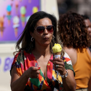 8月12日,在英国伦敦,一名女子吃冰淇淋降温。