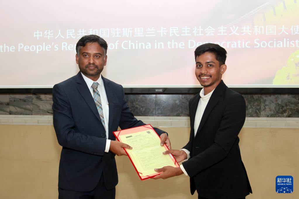8月13日,斯里兰卡教育和高等教育部副部长马图拉·塞内维拉特纳(左)在科伦坡为获得中国政府奖学金的学生颁发证书。新华社发(中国驻斯里兰卡大使馆供图)