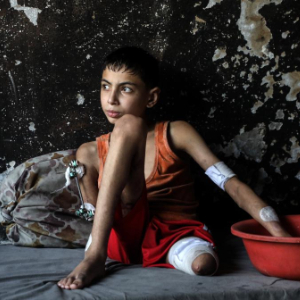 11岁的巴勒斯坦儿童萨米尔·扎库特在以军空袭中失去了右臂和左腿,造成永久残疾。