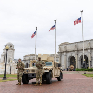 这是8月19日在美国首都华盛顿的联合车站外拍摄的国民警卫队成员和车辆。
