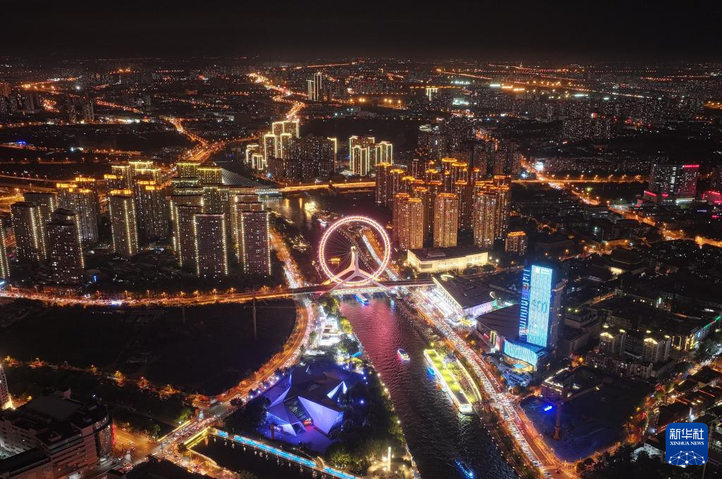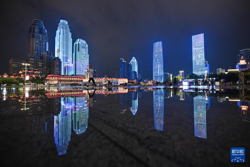 这是8月22日在天津站后广场拍摄的天津海河沿岸夜景(无人机照片)。