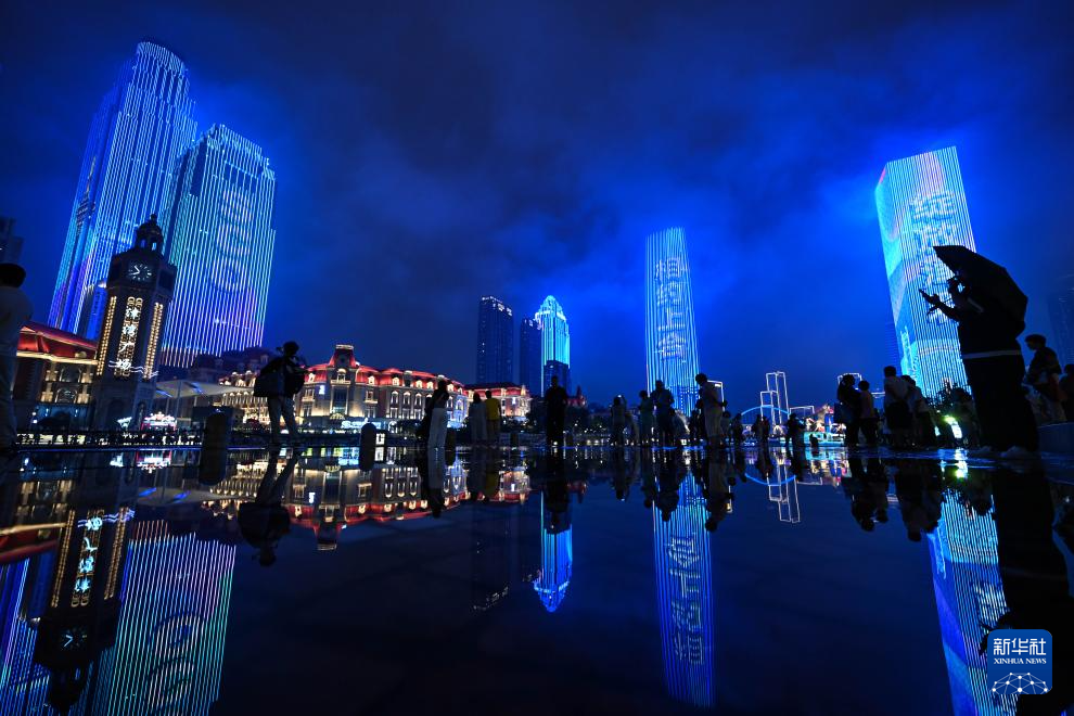 这是在天津站前广场拍摄的“海河之夜”灯光秀(8月22日摄)。
