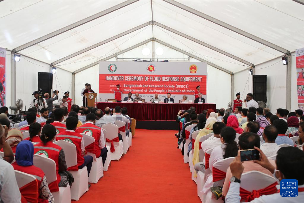 这是8月26日在孟加拉国首都达卡拍摄的中国政府援助孟加拉国抗洪物资捐赠仪式现场。新华社发(哈比卜·拉赫曼摄)