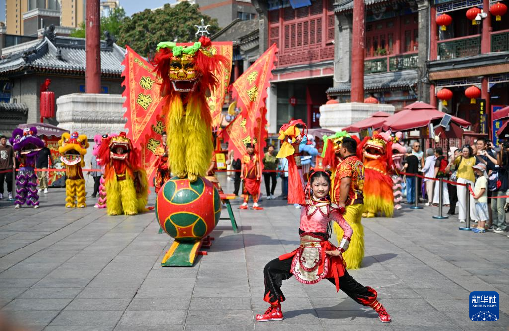 8月29日,民俗表演者在天津古文化街戏楼广场表演。