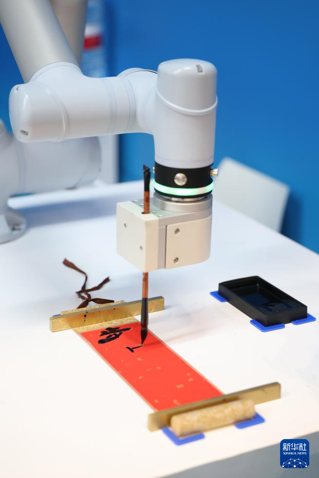 8月29日,在2025年上海合作组织峰会新闻中心,智能机器人进行书法展示。
