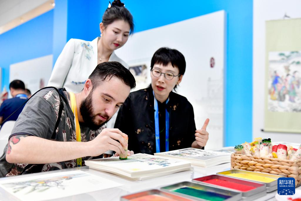 8月29日,在2025年上海合作组织峰会新闻中心非遗互动区,外国记者(左)体验制作天津杨柳青木版年画。