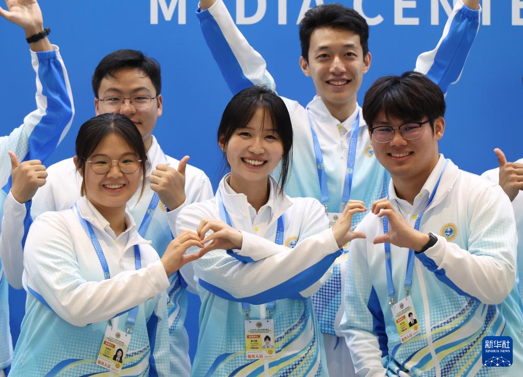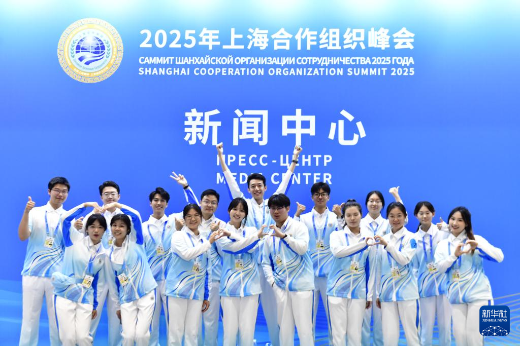 8月29日,志愿者在2025年上海合作组织峰会新闻中心合影。