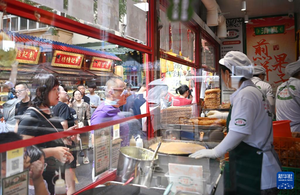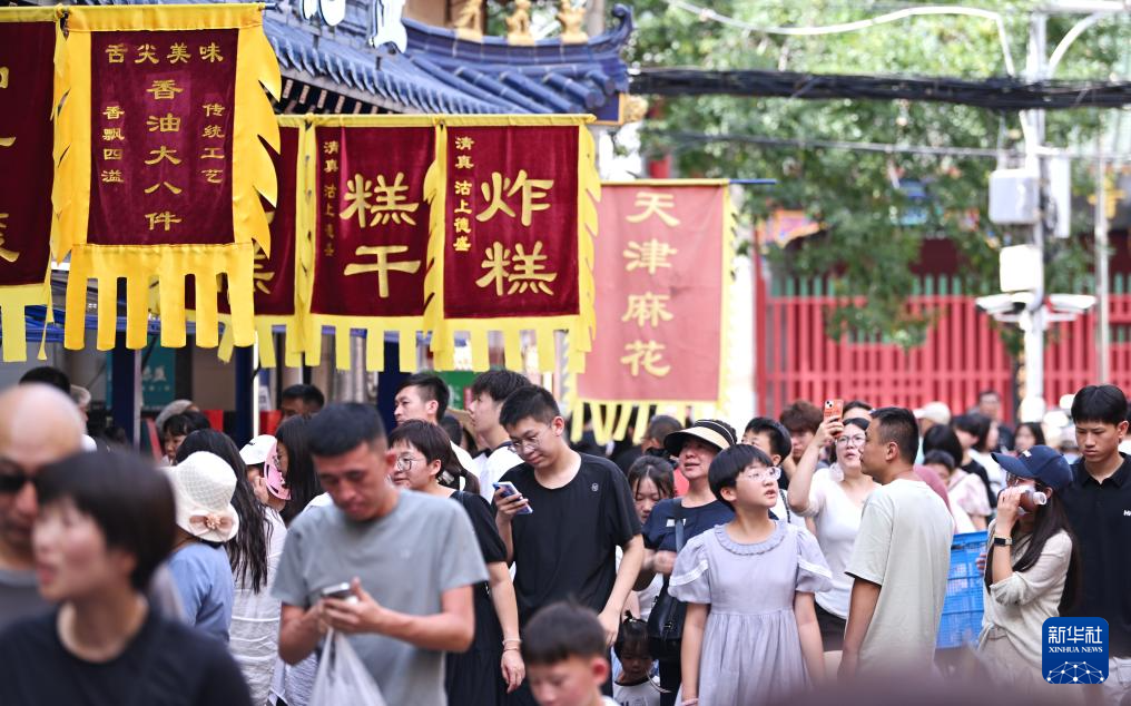 8月22日,游人在天津市红桥区西北角特色街区购买特色美食。
