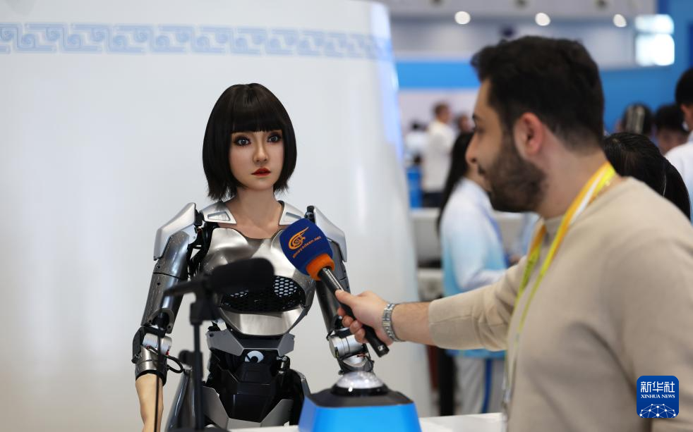 8月29日,外国记者在2025年上海合作组织峰会新闻中心采访人形机器人“小合”。
