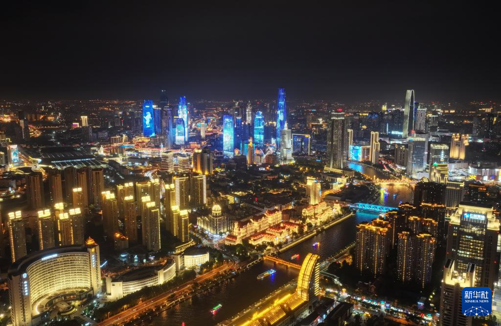 8月22日拍摄的天津海河夜景(无人机照片)。