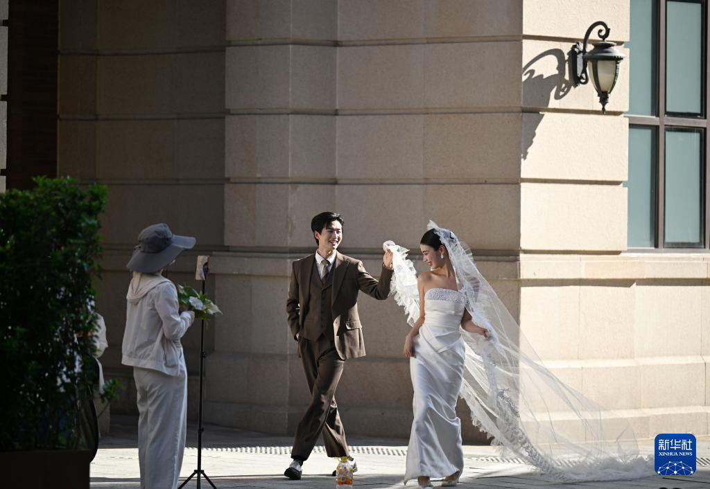 8月28日,一对新人在天津解放北路历史文化街区拍摄婚纱照。