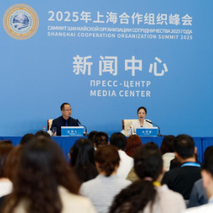 8月30日,在天津梅江国际会展中心,2025年上海合作组织峰会新闻中心举行上合组织睦邻友好合作委员会吹风会,上海合作组织睦邻友好合作委员会秘书长左洪波介绍该组织民间交往与合作,以及睦委会推进该组织民间外交工作情况,并回答记者提问。这是记者在吹风会现场提问。