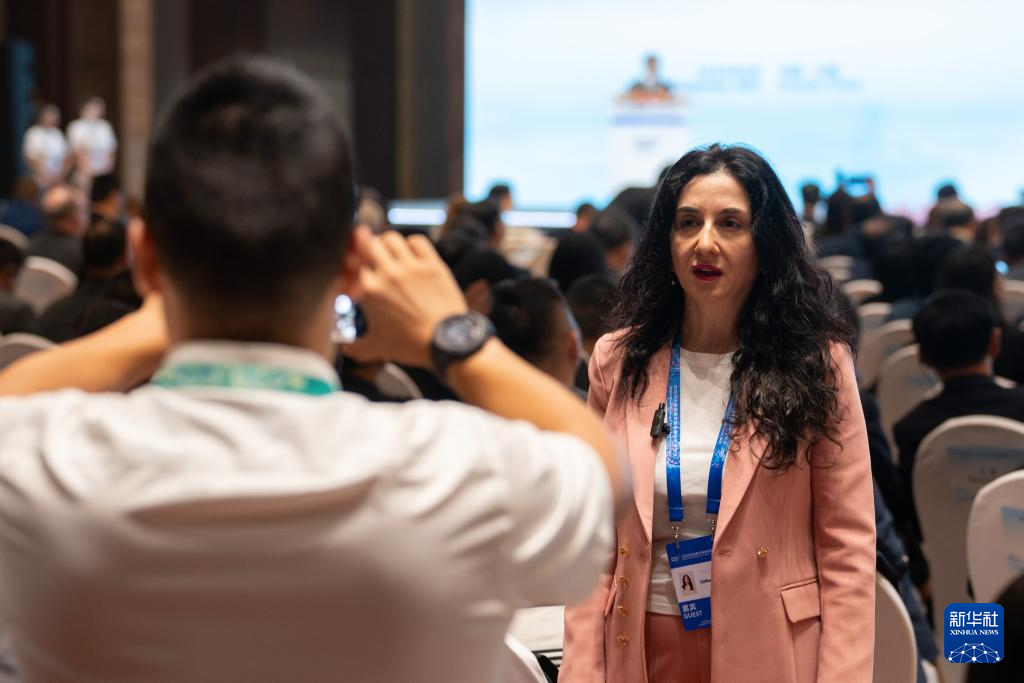 9月6日,出席2025全球南方媒体智库高端论坛的代表(右)在开幕式会场接受媒体采访。