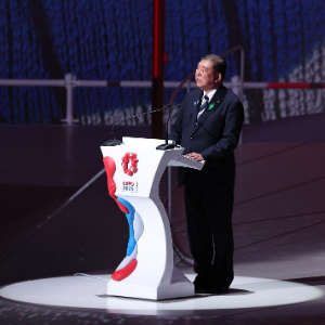 这是4月12日石破茂在2025年大阪·关西世博会开幕式上致辞的资料照片。新华社记者 贾浩成 摄