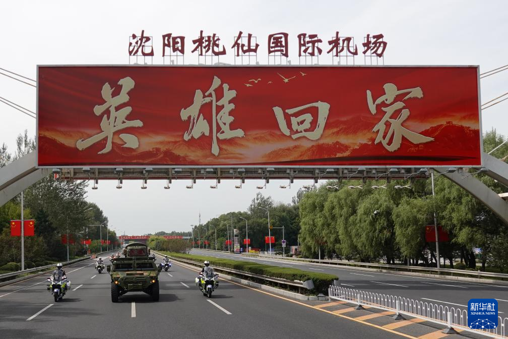 9月12日,第十二批在韩中国人民志愿军烈士遗骸回国。这是运送志愿军烈士遗骸的车队经过沈阳街头“英雄回家”标语牌。