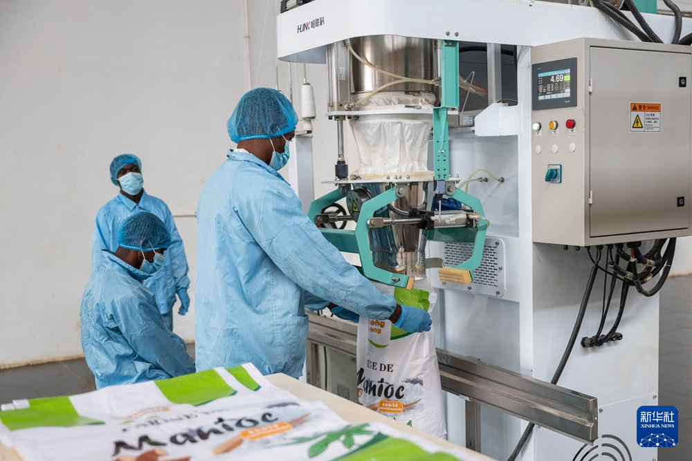 9月10日,在刚果(布)西部布恩扎省卢迪马镇生生农业科技有限公司,工作人员把木薯粉装袋。 新华社记者 郑扬子 摄