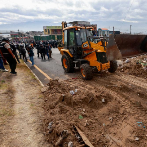 9月16日,在厄瓜多尔首都基多,一辆推土机在清理示威者设置的路障。