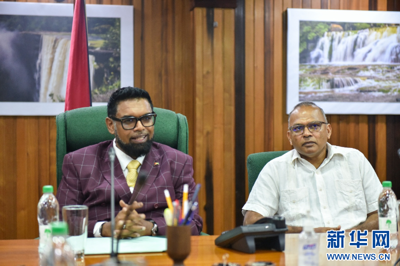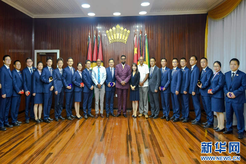 圭亚那总统伊尔凡·阿里(左)在圭亚那首都乔治敦总统办公室会见即将离任的中国(江苏)第20期援圭亚那医疗队(中国医疗队供图)