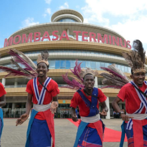 9月17日,在蒙内铁路蒙巴萨终点站,身穿传统民族服装的演员跳舞庆祝蒙巴萨通勤米轨修复项目完工。新华社记者 杨光 摄