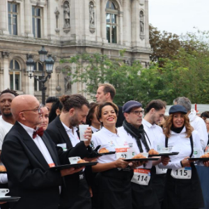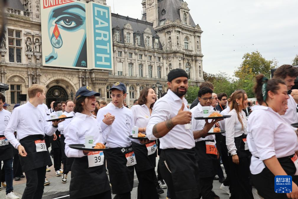 大约九点半,近400名“专业选手”齐聚巴黎市政厅广场。他们当中有资深从业者,也有学徒工。男女老少同台亮相,勾勒出生动的行业群像。发令枪响,他们单手托起放着一杯水、一个咖啡杯和一块羊角面包的托盘,以尽可能快的步伐完成约4公里赛程。名曰“赛跑”,规则却禁止奔跑,只能快走。过程中,托盘里的东西必须保持完好——不得洒出,更不可偷吃。