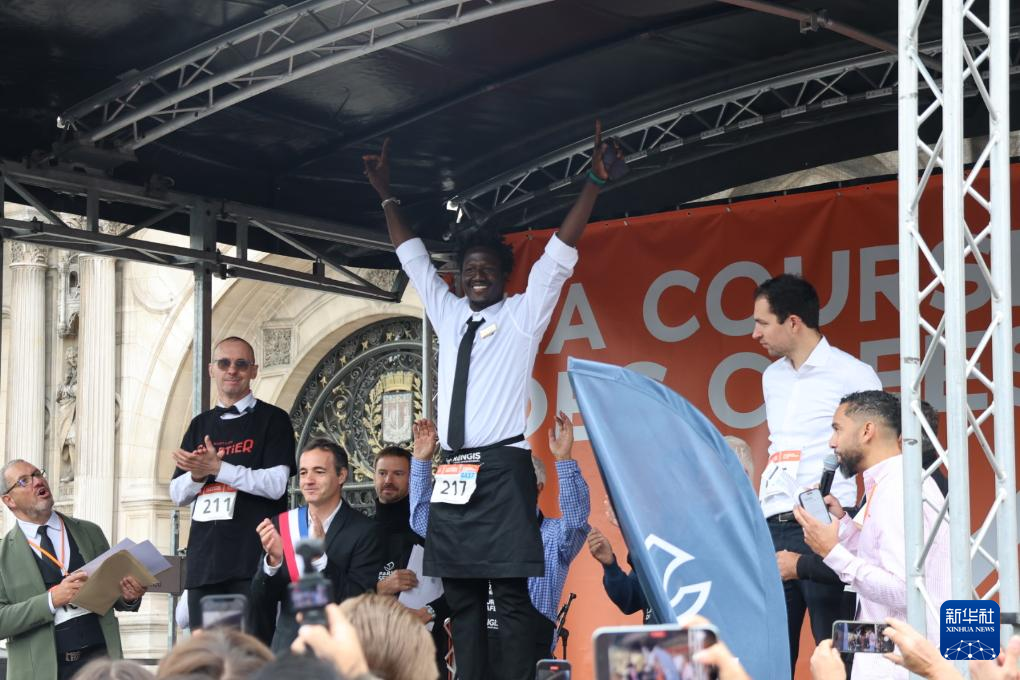 9月21日,在法国巴黎,在“咖啡馆赛跑”中获胜的选手上台领奖。新华社记者 张百慧 摄
