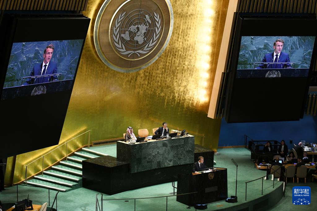 9月22日,在位于纽约的联合国总部,法国总统马克龙在和平解决巴勒斯坦问题和落实“两国方案”高级别国际会议上讲话。