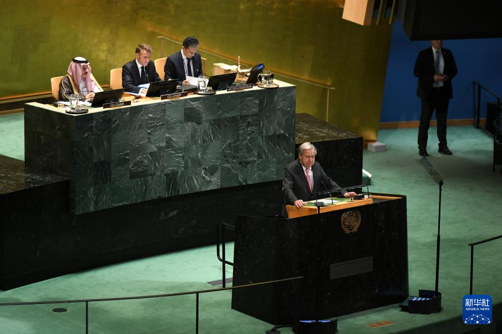 9月22日,在位于纽约的联合国总部,联合国秘书长古特雷斯(前)在和平解决巴勒斯坦问题和落实“两国方案”高级别国际会议上讲话。