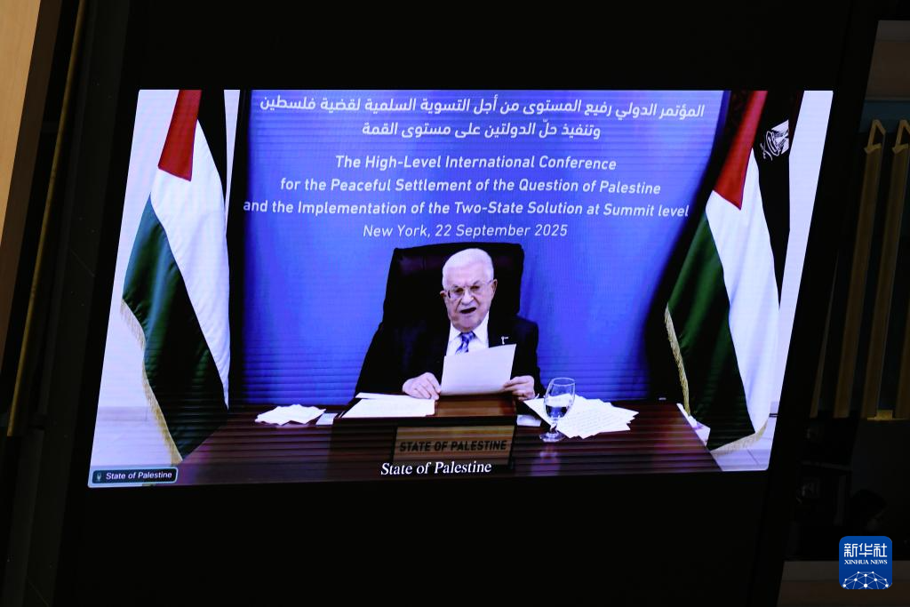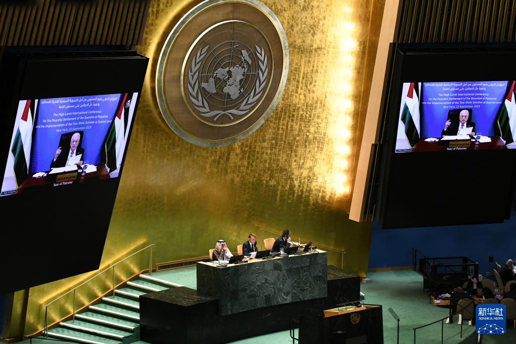 9月22日,在位于纽约的联合国总部,巴勒斯坦总统阿巴斯在和平解决巴勒斯坦问题和落实“两国方案”高级别国际会议上发表视频讲话。