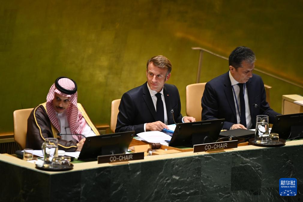 9月22日,在位于纽约的联合国总部,法国总统马克龙(中)与沙特阿拉伯外交大臣费萨尔(左)共同主持和平解决巴勒斯坦问题和落实“两国方案”高级别国际会议。