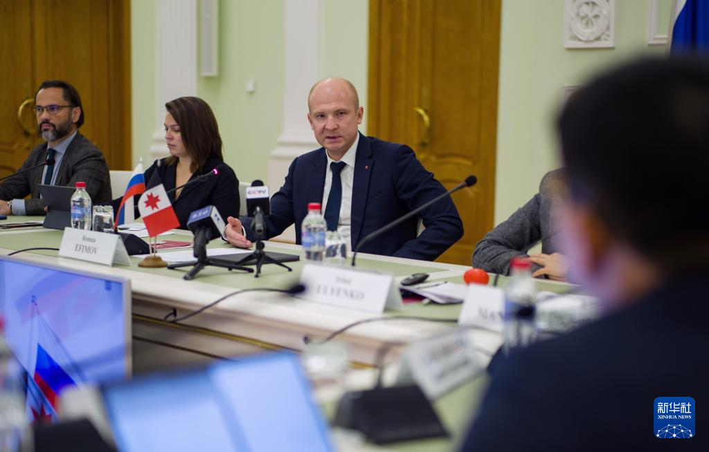 9月24日,俄罗斯联邦乌德穆尔特共和国政府主席罗曼·叶菲莫夫(左三)在乌德穆尔特共和国首府伊热夫斯克接受新华社记者采访。新华社记者 孟菁 摄