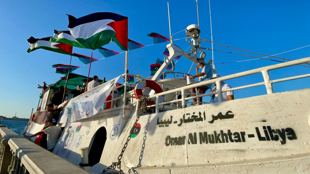 9月21日,在利比亚的黎波里,一艘向加沙运送人道主义救援物资的船只准备启航。新华社发(哈姆扎·图尔基亚摄)