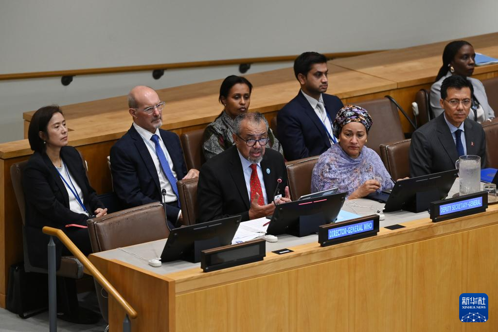 9月25日,在位于纽约的联合国总部,世界卫生组织总干事谭德塞(前左)在第四次联合国非传染性疾病和心理健康高级别会议上讲话。新华社记者 李睿 摄