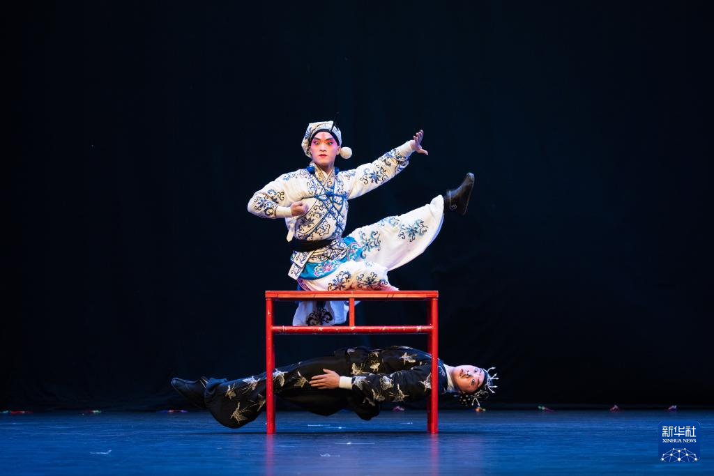 9月25日,在刚果(金)首都金沙萨,演员表演婺剧《三岔口》。新华社记者 郑扬子 摄