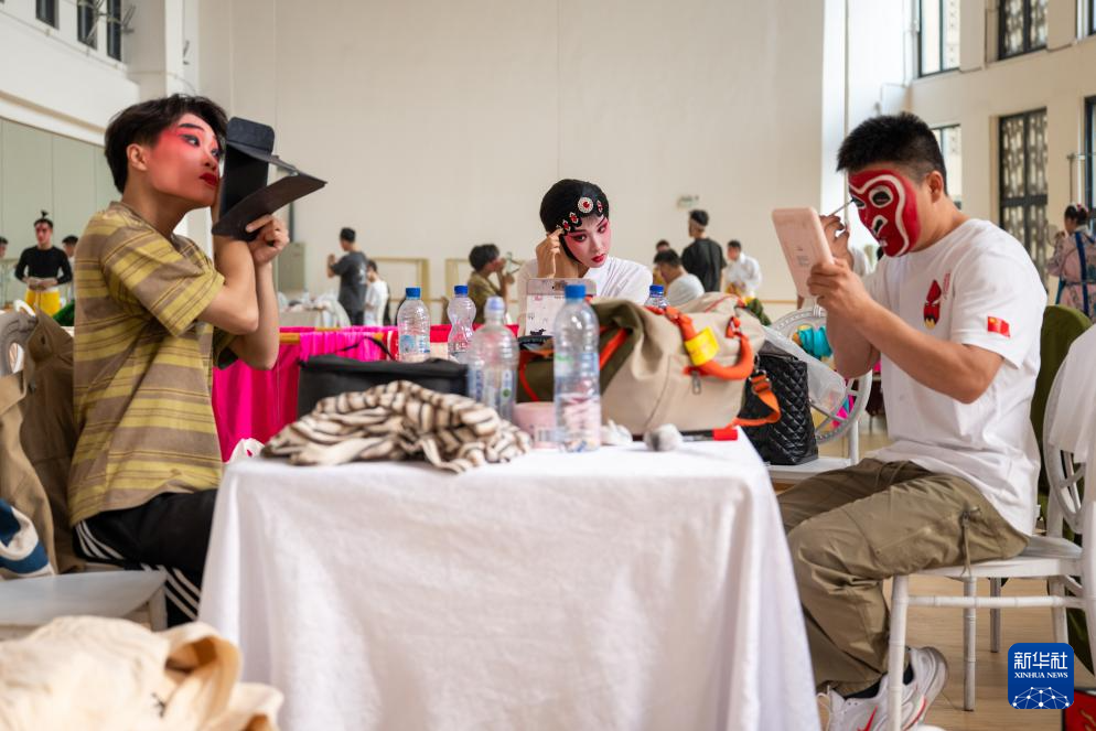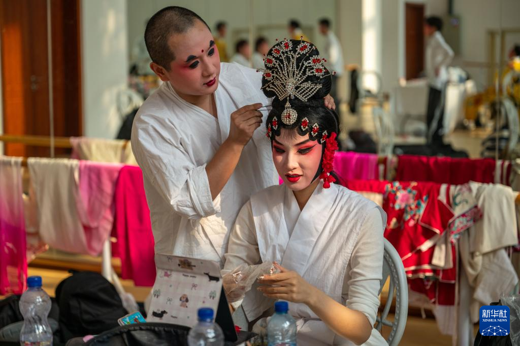 9月25日,在刚果(金)首都金沙萨,来自中国的婺剧演员在后台化妆备演。新华社记者 郑扬子 摄