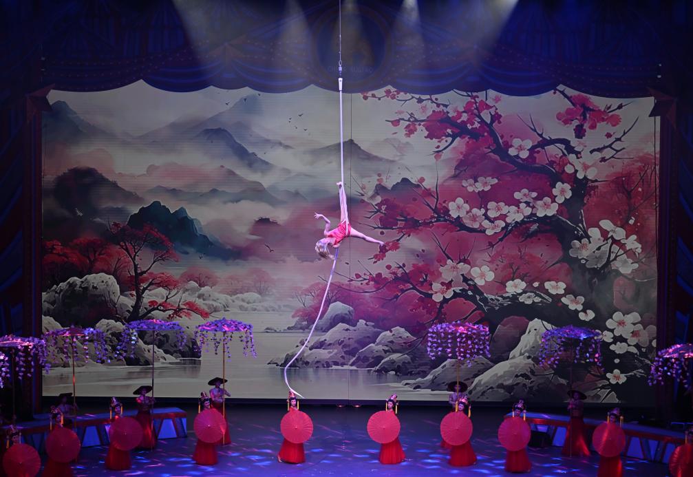 新华社石家庄10月1日电(记者黄昱璋、董笑坤、白林)在一座名为“东方杂技城”的崭新场馆内,一群来自俄罗斯的女子杂技演员身着民族服饰,借助跳板的弹射力量,在高空中转身翻腾,又平稳落地,引得观众席掌声雷动。