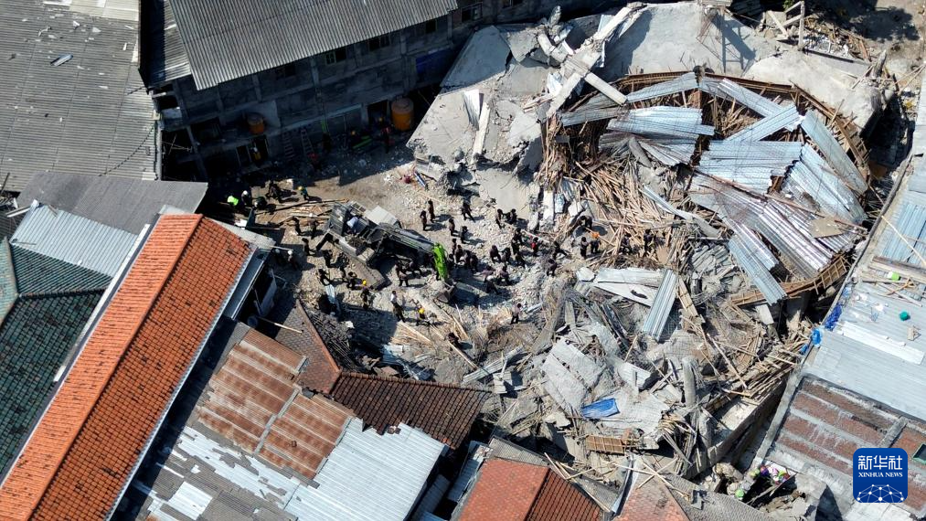 10月4日,救援人员在印度尼西亚东爪哇省诗都阿佐县的学校建筑物倒塌事故现场搜救(无人机照片)。新华社发(萨赫兰摄)