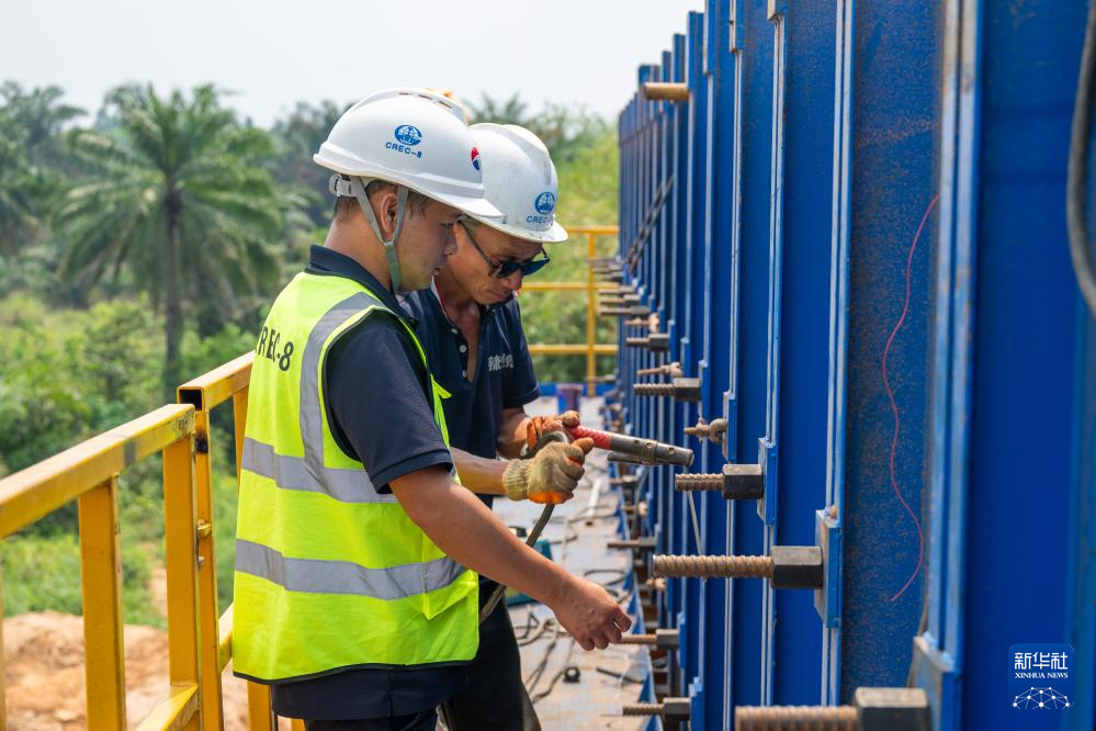 10月3日,在刚果(金)首都金沙萨,中国工程师在首都环线公路项目的桥梁施工现场工作。新华社记者 郑扬子 摄
