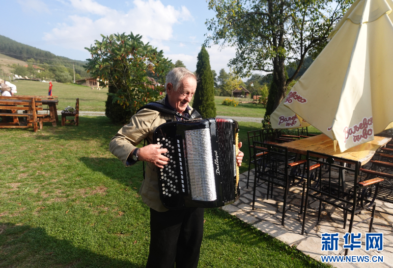 当地时间9月29日,在塞尔维亚西南部马连山区的“好客民族村”民俗村落,一位当地村民手拉手风琴,演奏传统民谣,欢迎中国游客到访。新华网记者陈颖 摄