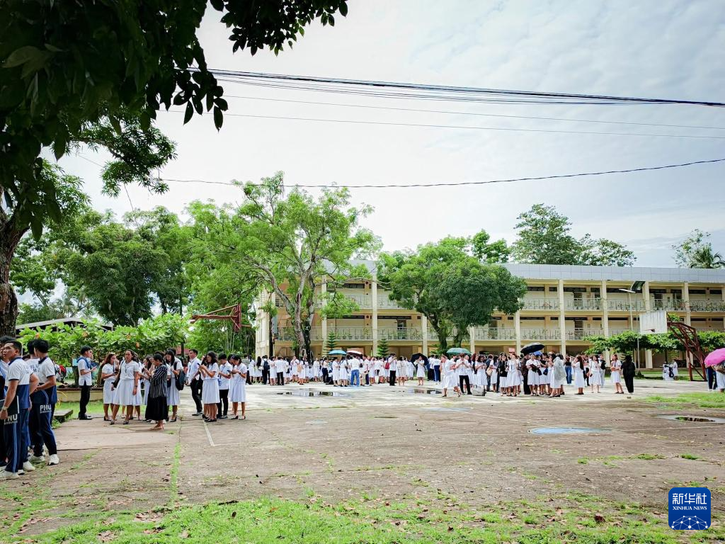 10月10日,在菲律宾南达沃省一所学校,人们从建筑物中疏散至户外。