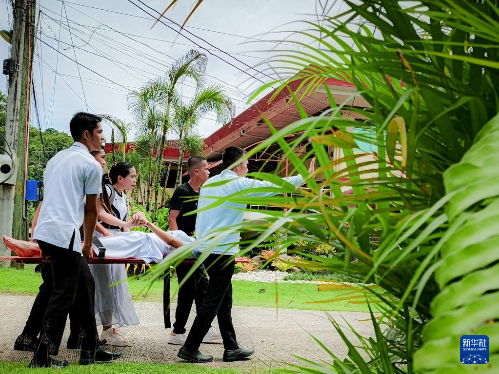 10月10日,在菲律宾南阿古桑省一所大学,地震中受伤人员被撤离至建筑物外并接受治疗。