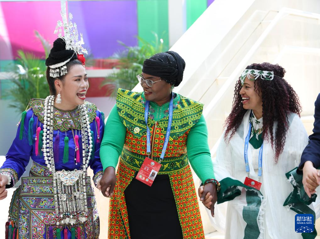 10月14日,来自坦桑尼亚和埃塞俄比亚的嘉宾在展览现场上与侗族大歌表演者们一起载歌载舞。