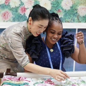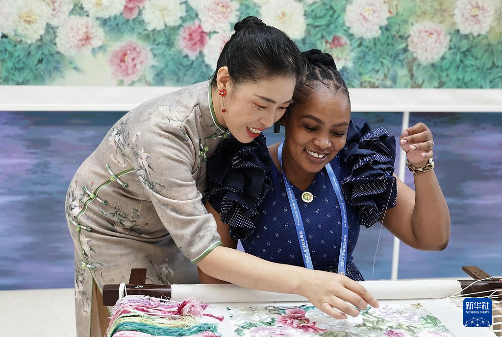 10月14日,来自博茨瓦纳的嘉宾在展览上体验中国刺绣。